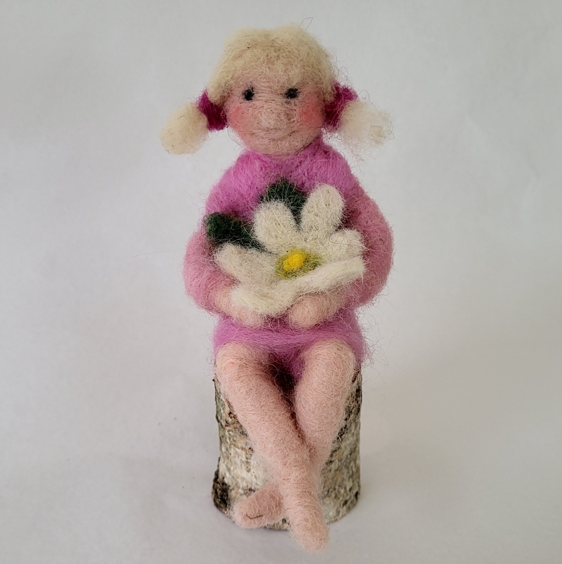 Uniikki, suomalaisesta lampaanvillasta neulahuovutettu Aino istumassa koivukannolla. Korkeus n 14 cm