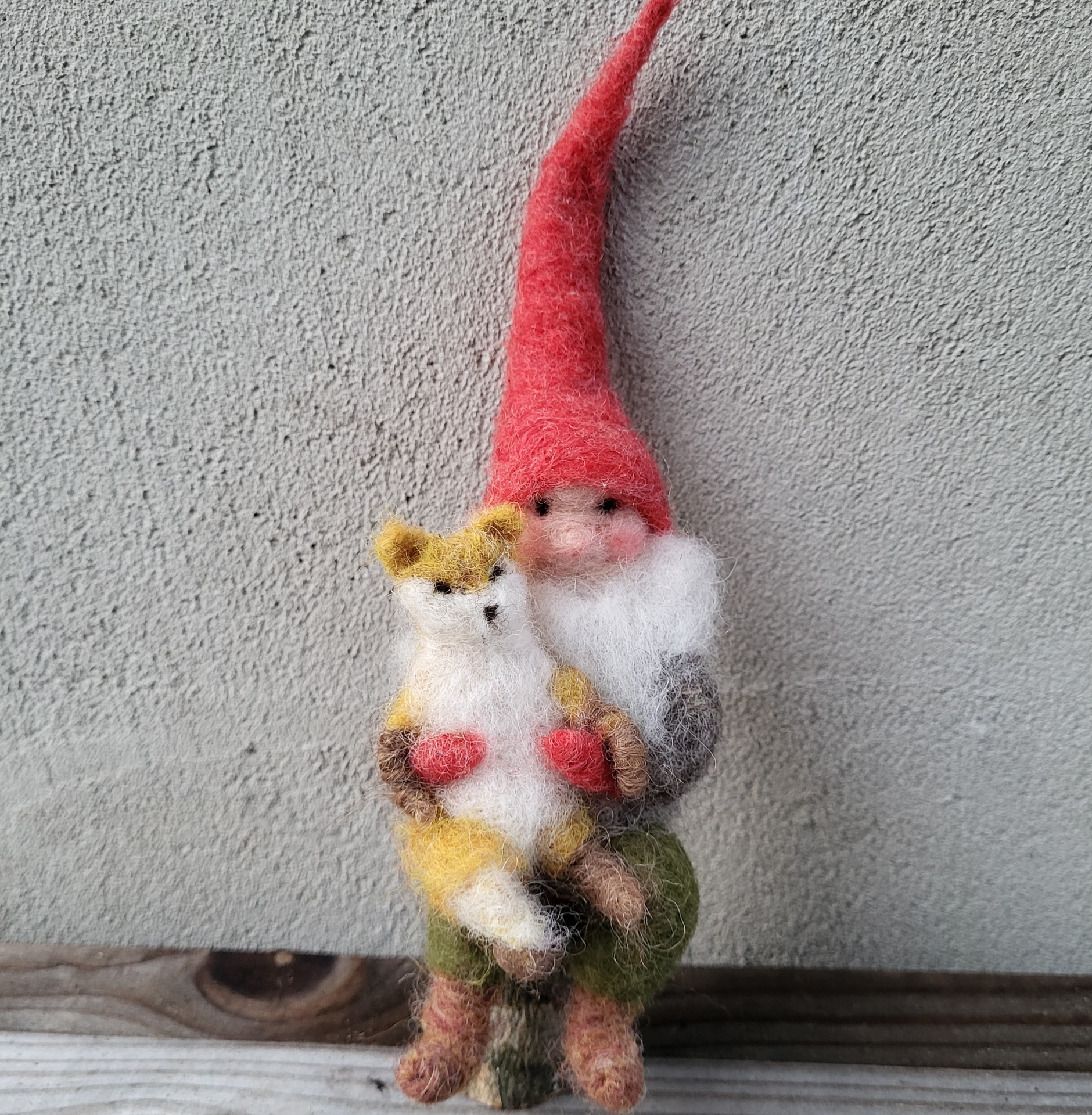 Uniikki, suomalaisesta lampaanvillasta neulahuovutettu tonttu ja kettu istumassa kannolla. Korkeus 21 cm