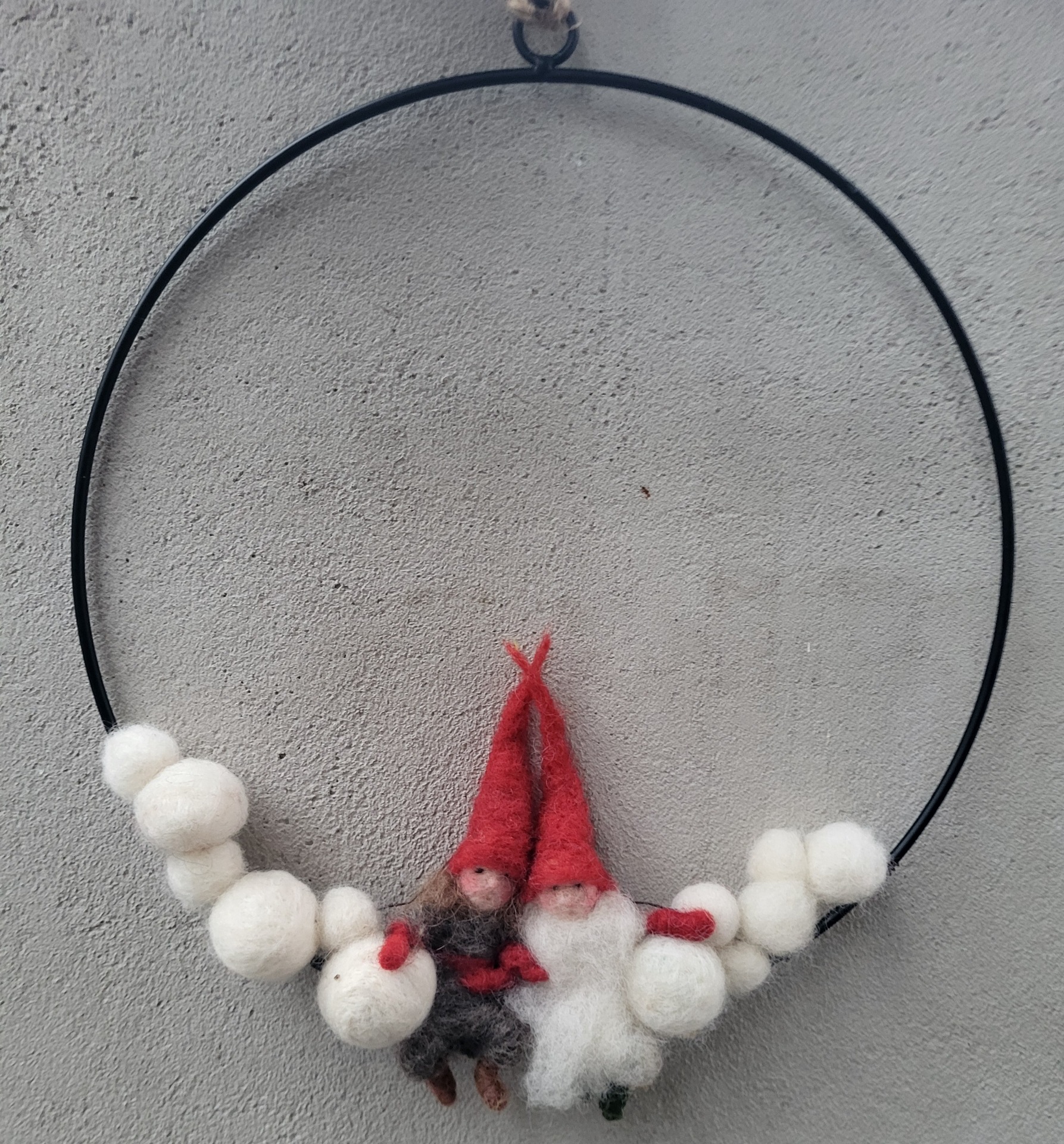 Metallikranssi, jossa suomalaisesta lampaanvillasta neulahuovutetut tontut ja pallot, halkaisija 27 cm