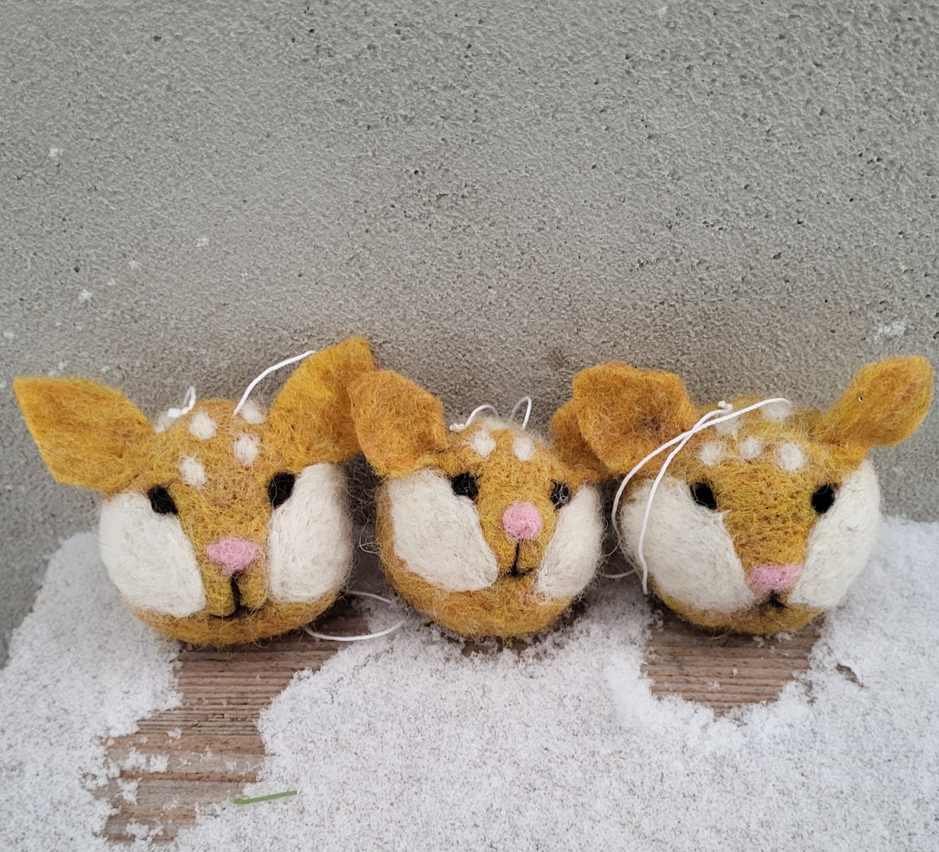 Uniikit eläinhahmo-kuusenpallot 3 kpl. Huovutettu suomalaisesta lampaanvillasta. Halkaisija n 6-7 cm.