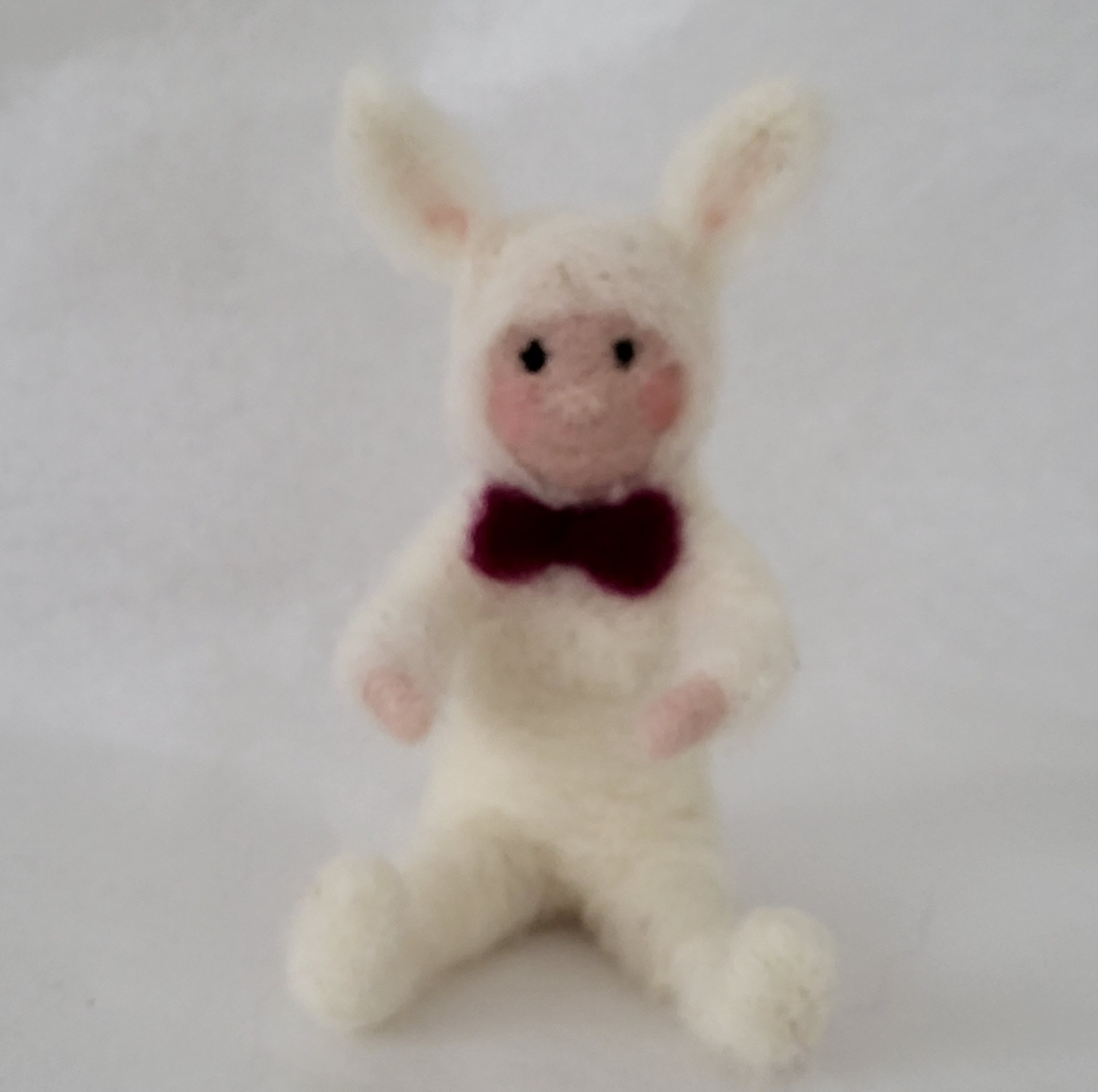Uniikki neulahuovutettu pupu suomalaisesta lampaanvillasta, jonka syliin voit laittaa pääsiäismunan. Korkeus n. 12 cm