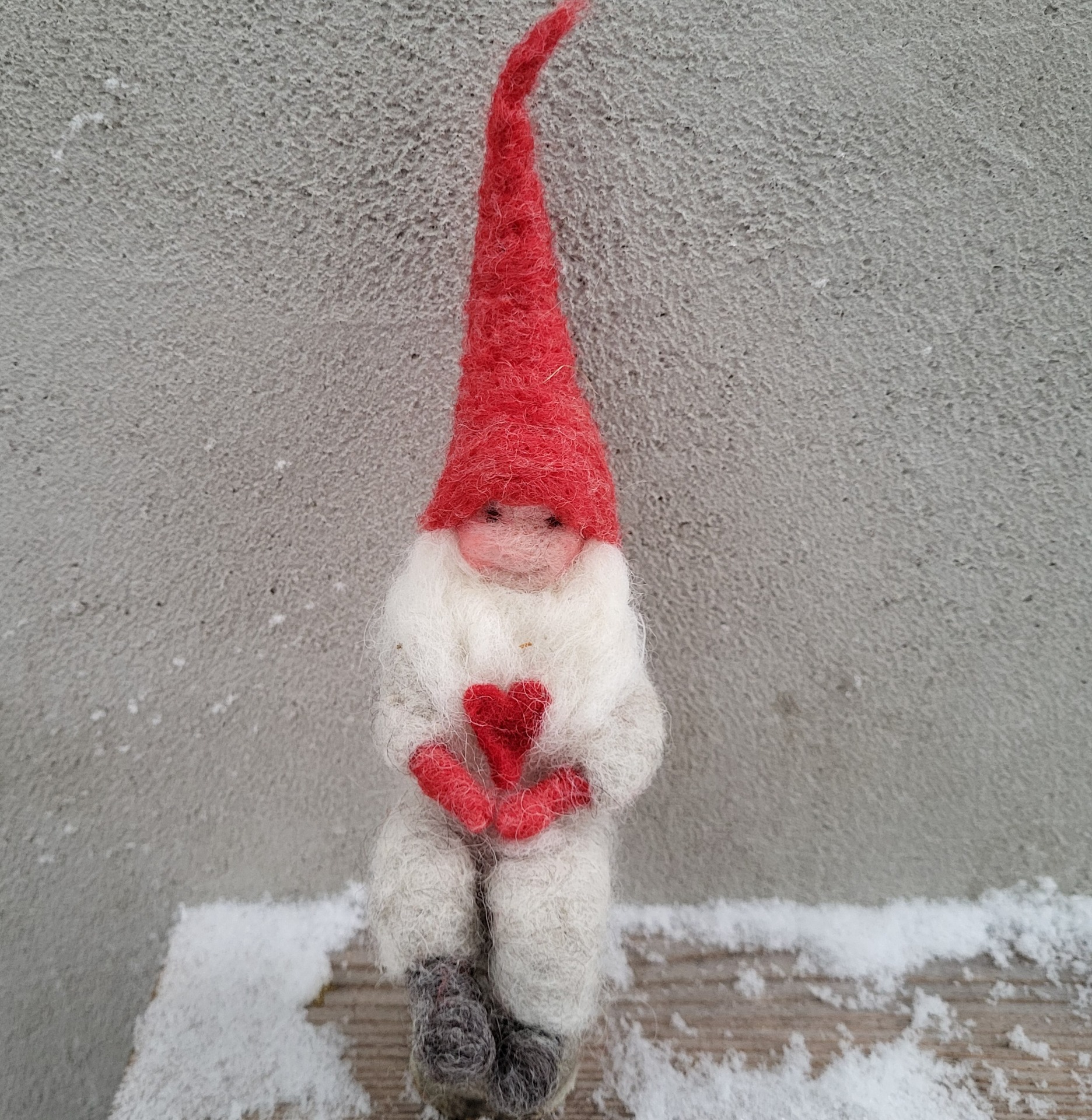 Uniikki, Oiva sydäntonttu. Suomalaisesta lampaanvillasta neulahuovutettu tonttu. Korkeus 20 cm