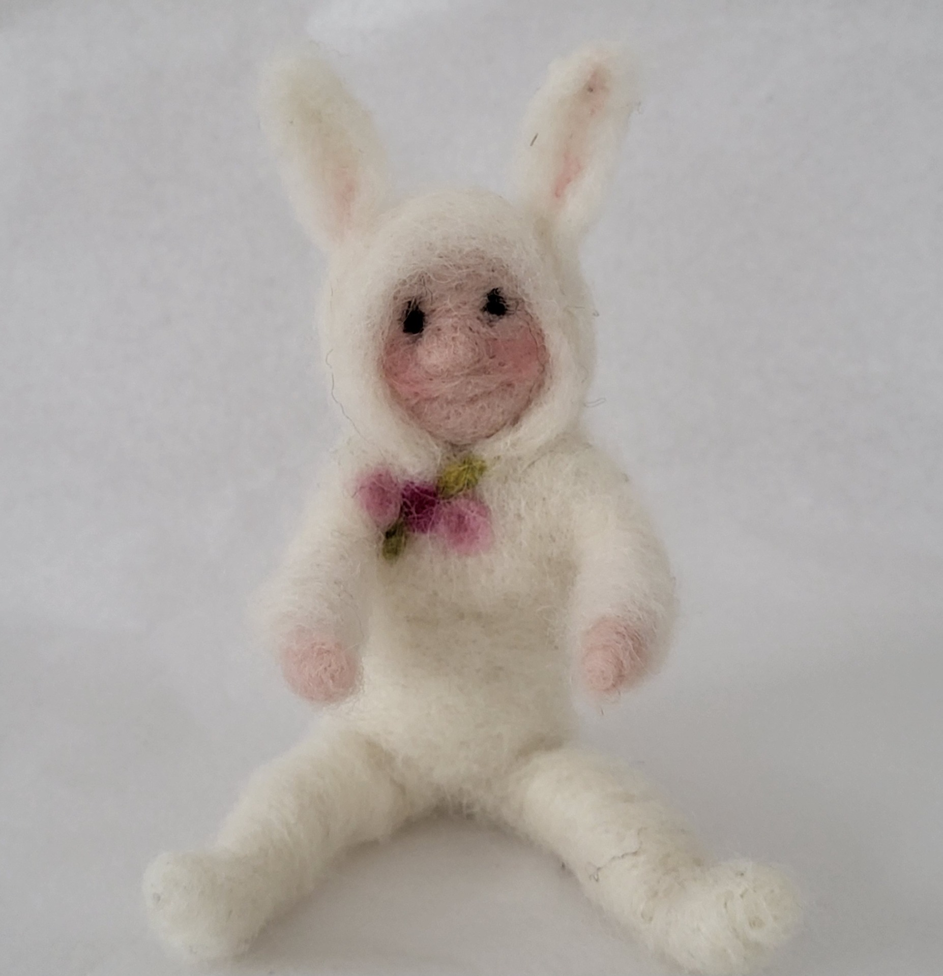 Uniikki neulahuovutettu pupu suomalaisesta lampaanvillasta, jonka syliin voit laittaa pääsiäismunan. Korkeus n. 12 cm