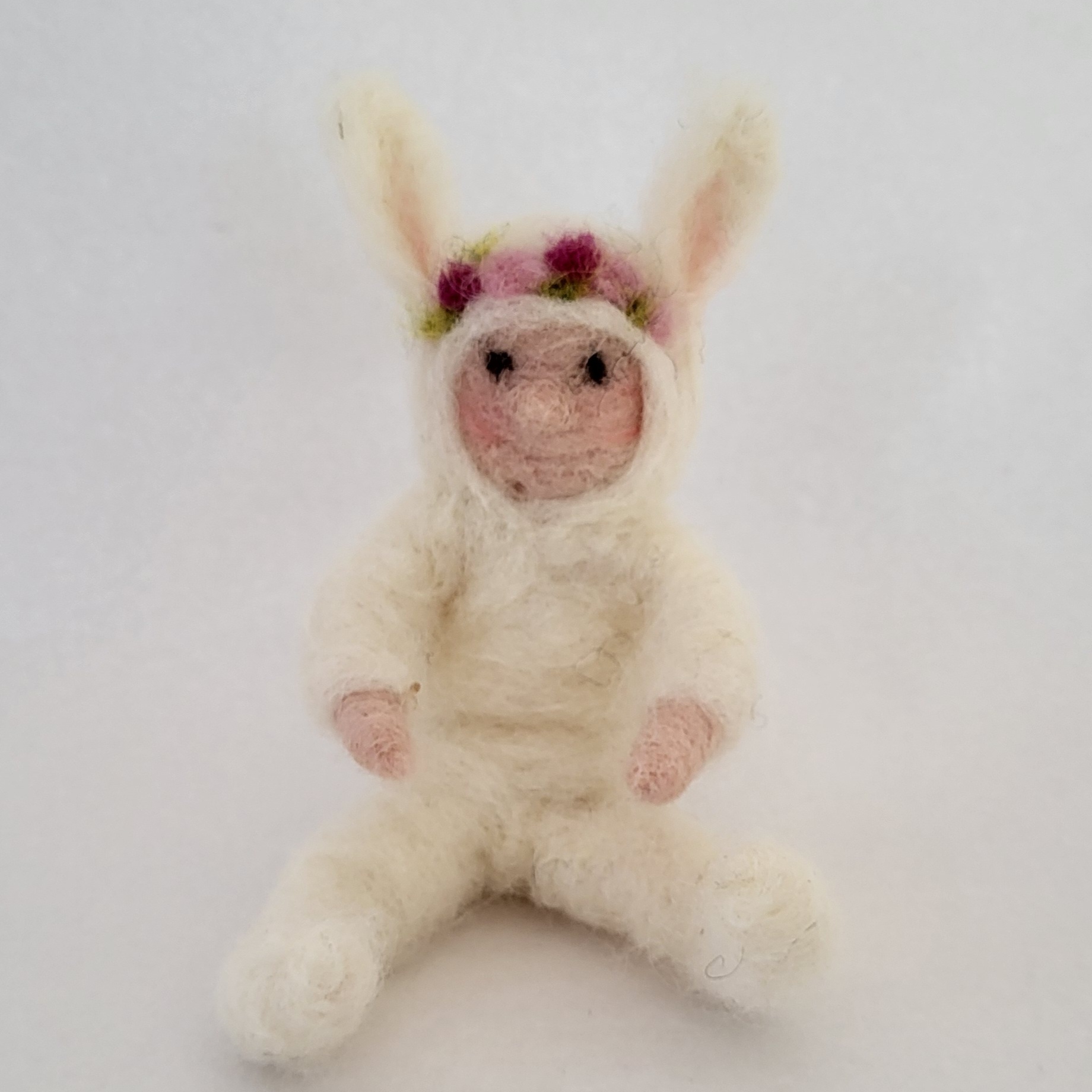Uniikki, neulahuovutettu pupu suomalaisesta lampaanvillasta. Pupun syliin voit laittaa pääsiäismunan. Korkeus n. 12 cm (istuen).